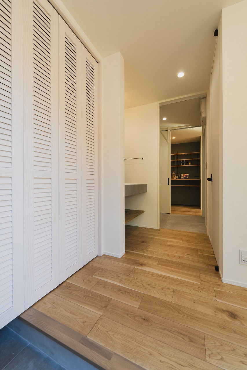 奥様の強いご要望により、玄関扉横にデザイン性の高いルーバータイプの建具を採用 [07:02]。