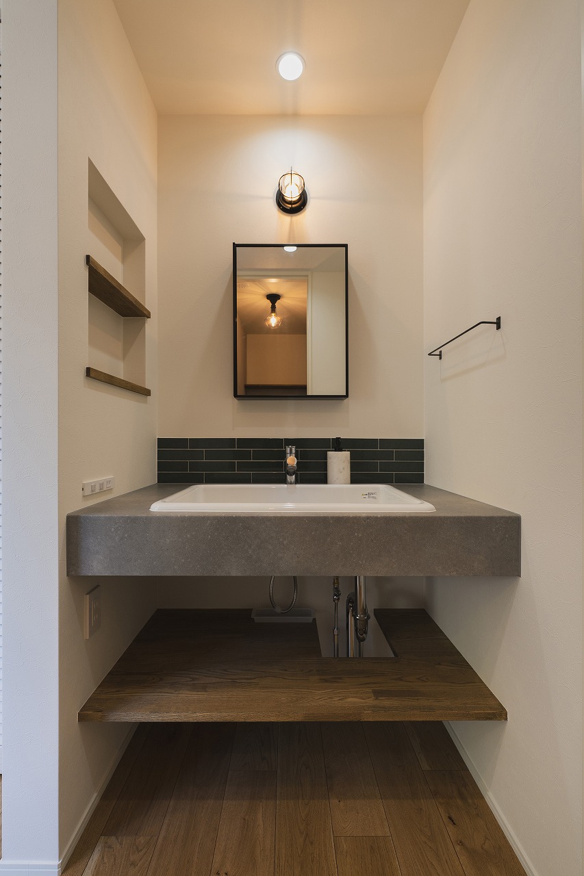 洗面台はワイド1200mmと広さを抑えつつ、深い病院用シンク [08:23] を採用することで、ゴシゴシ洗いなどの実用性を確保しました。