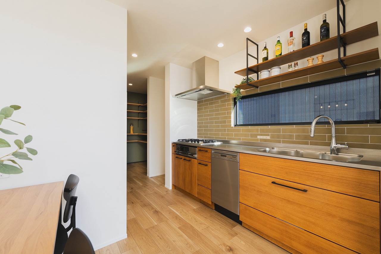 壁付けながら、ウッドワンのスイージー [14:00] や、あえて見せるかっこいいガスコンロ [14:03] を採用し、デザイン性を高めています。