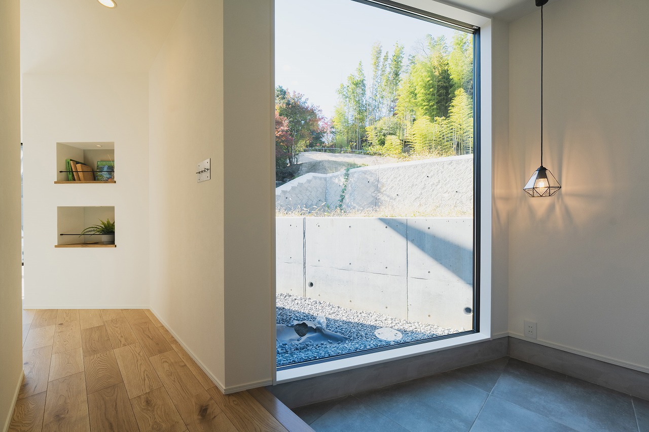 面積的に玄関を広く取れない代わりに、真正面をガラス張りにすることで視覚的な開放感を確保 [04:13]。将来のシンボルツリー設置を見据えています [04:05]。