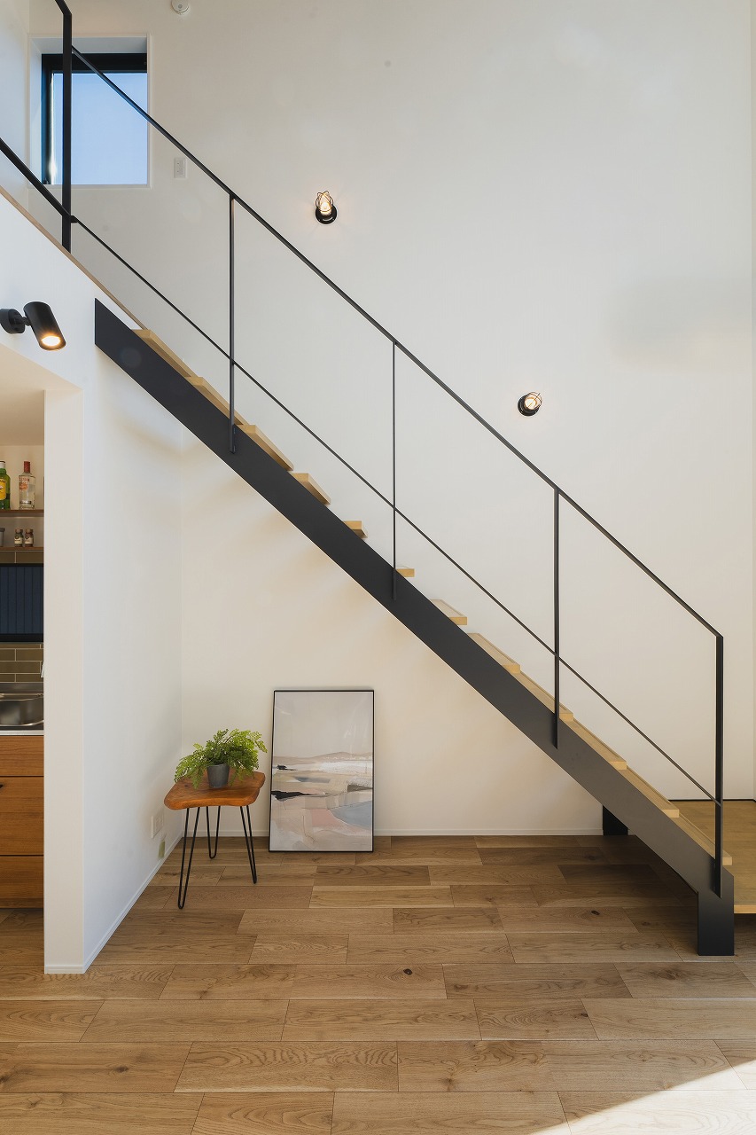 スケルトン階段 [20:59] の壁を利用し、7年間にわたる家づくりの歴史や海外赴任中の思い出を飾るギャラリースペースとして計画 [21:07]。