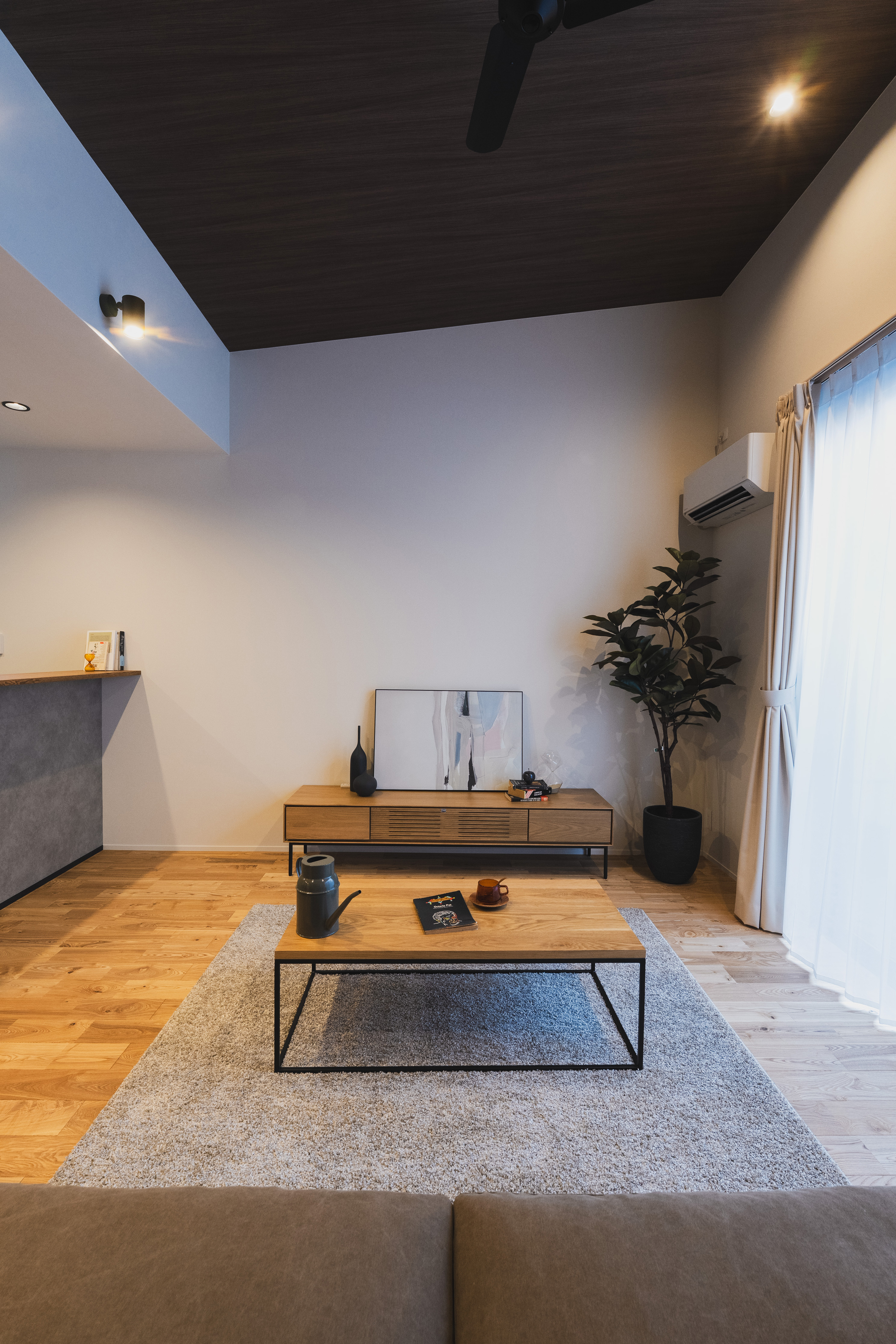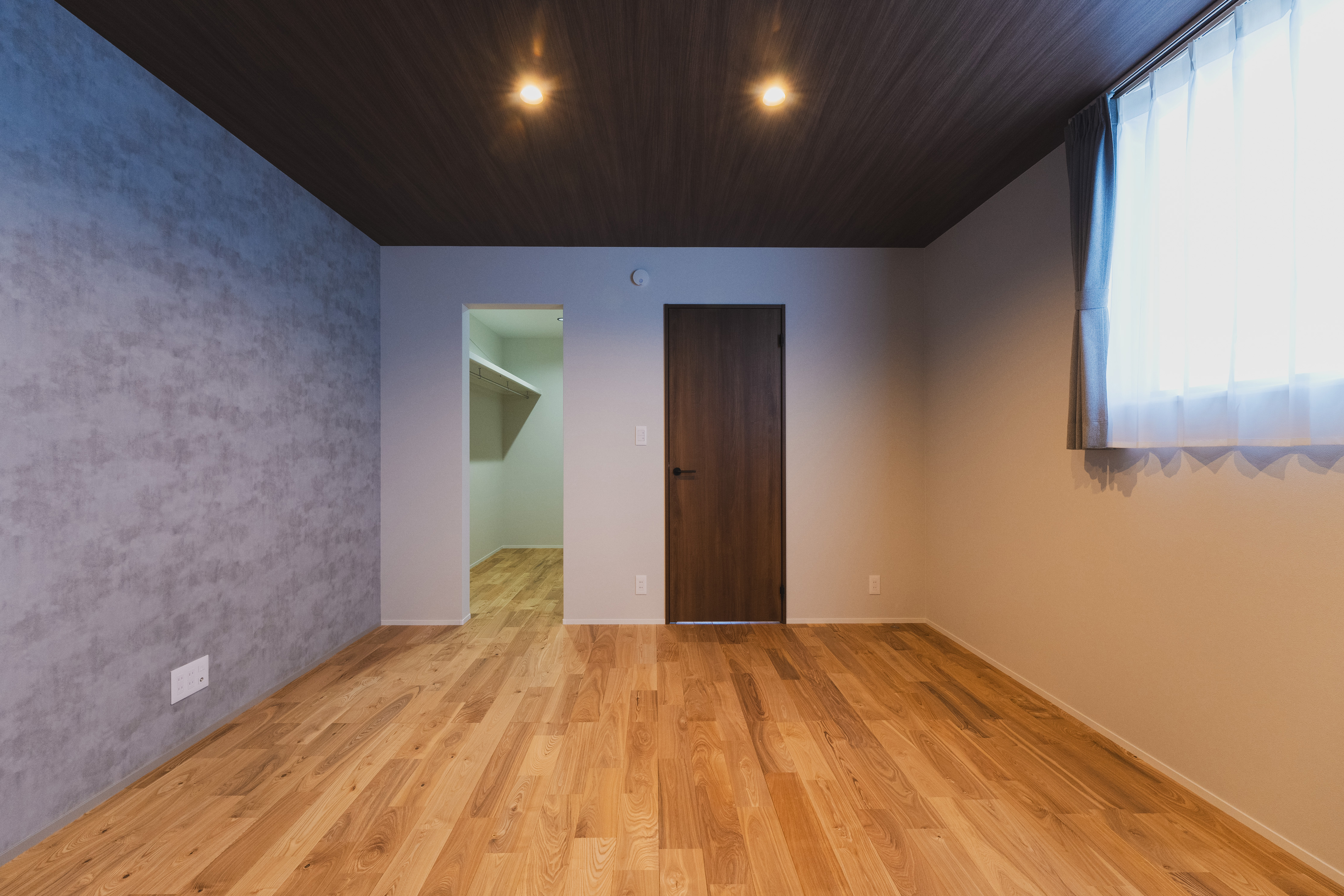 広さは17.5帖。ウォールナット系の建具とフローリング(タモ材)で統一し、落ち着いたアンティークテイストを演出。