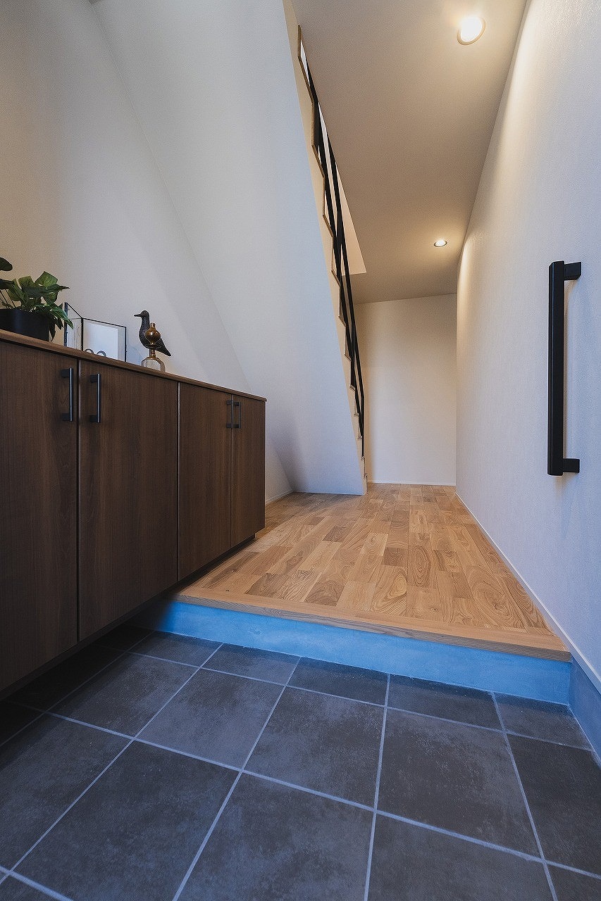 ウォールナット系の壁面収納を採用。内部には傘収納を備えました。