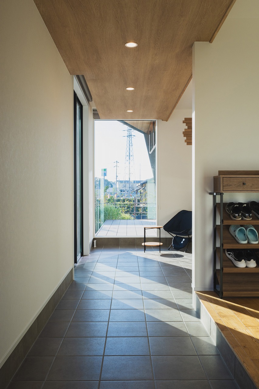 「わーっと驚く玄関」をコンセプトにした広い玄関土間。土間から屋外デッキへの動線を確保し、アウトドア用品の出し入れのしやすさや、バーベキューをしやすいようにしています。