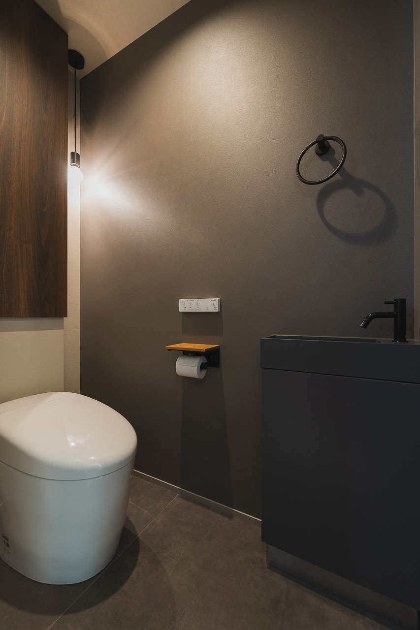 1階トイレ奥の壁をくり抜き、扉付きの可動棚収納を大工工事で造作。利便性とデザイン性を高める、ご主人のこだわりが光るアイデアです。