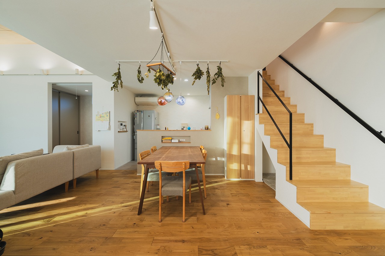ダイニングの照明には、家具の配置が変わっても対応できるようにダクトレールを十字型に配置。将来的なレイアウト変更を想定した柔軟な計画です。