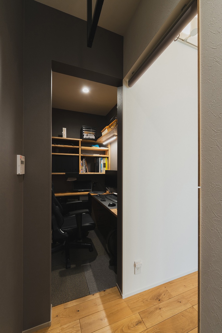 LDKの一角に、2帖に満たないコンパクトな個室のワークスペースを配置。あえて狭くすることで集中力を高めるという設計士ならではの発想です。