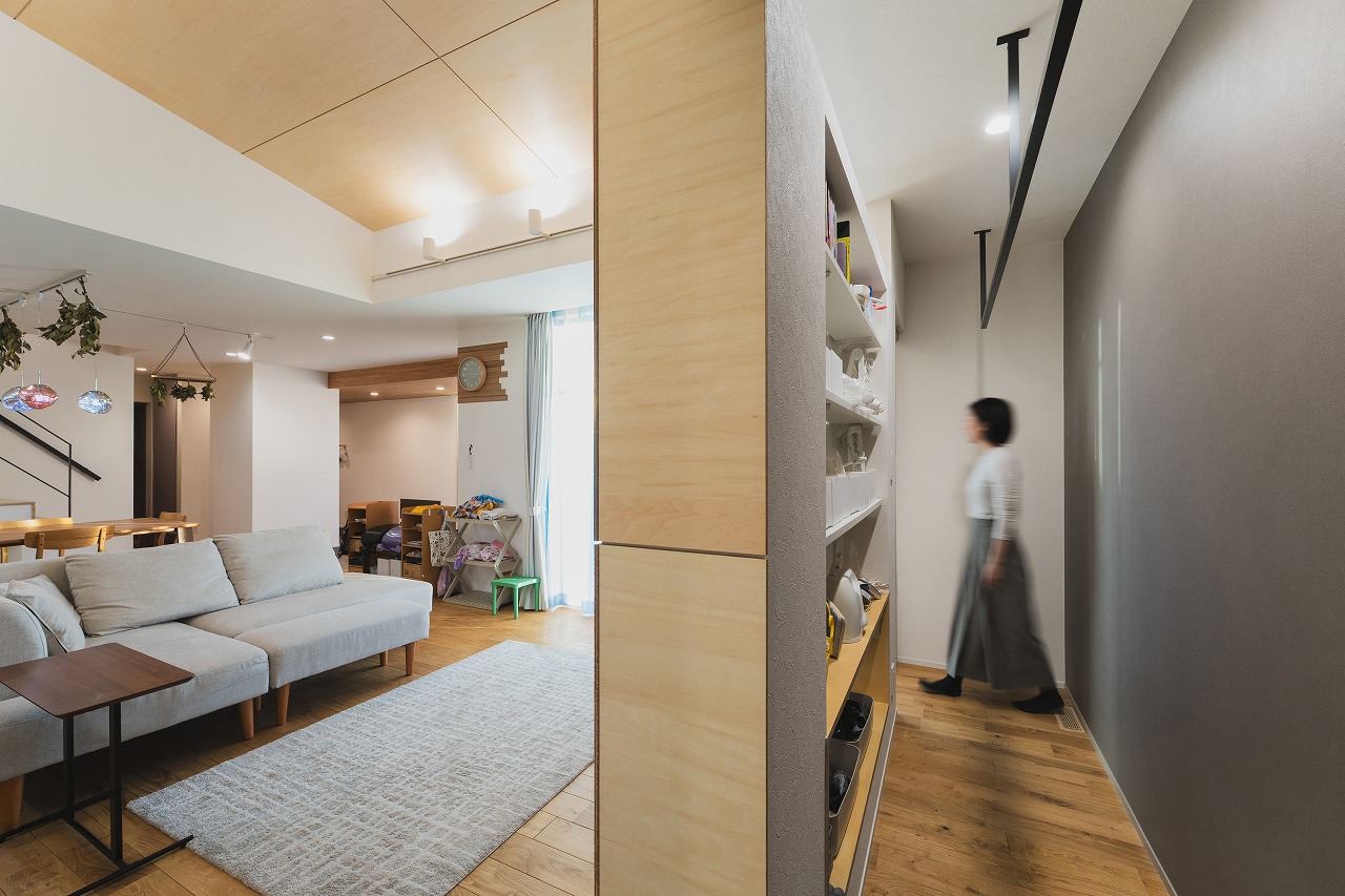 キッチンやLDKから、玄関に置かれた家族の靴(オープン収納)や宅急便の荷物が見えないよう、絶妙な位置に目隠し壁を造作。解放感を保ちつつ、生活感を隠す工夫です。