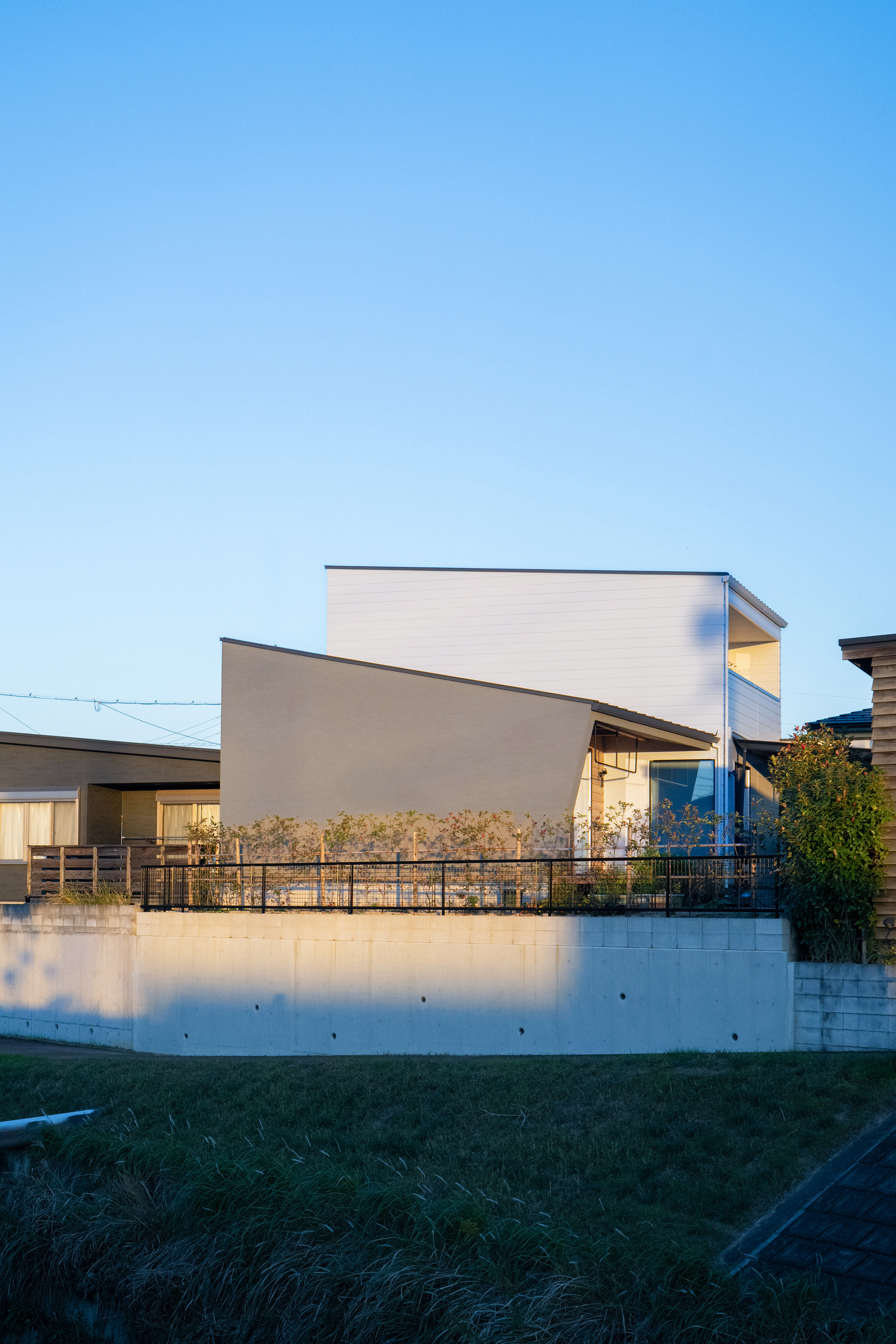 金属系のSPビレクト(ラップサイディング系)をベースに採用 [03:15]。また、あえて川沿いの通路に面した一部にはベルアート(塗り壁)を採用し、歩行者からの視線を意識したデザイン [06:32]。