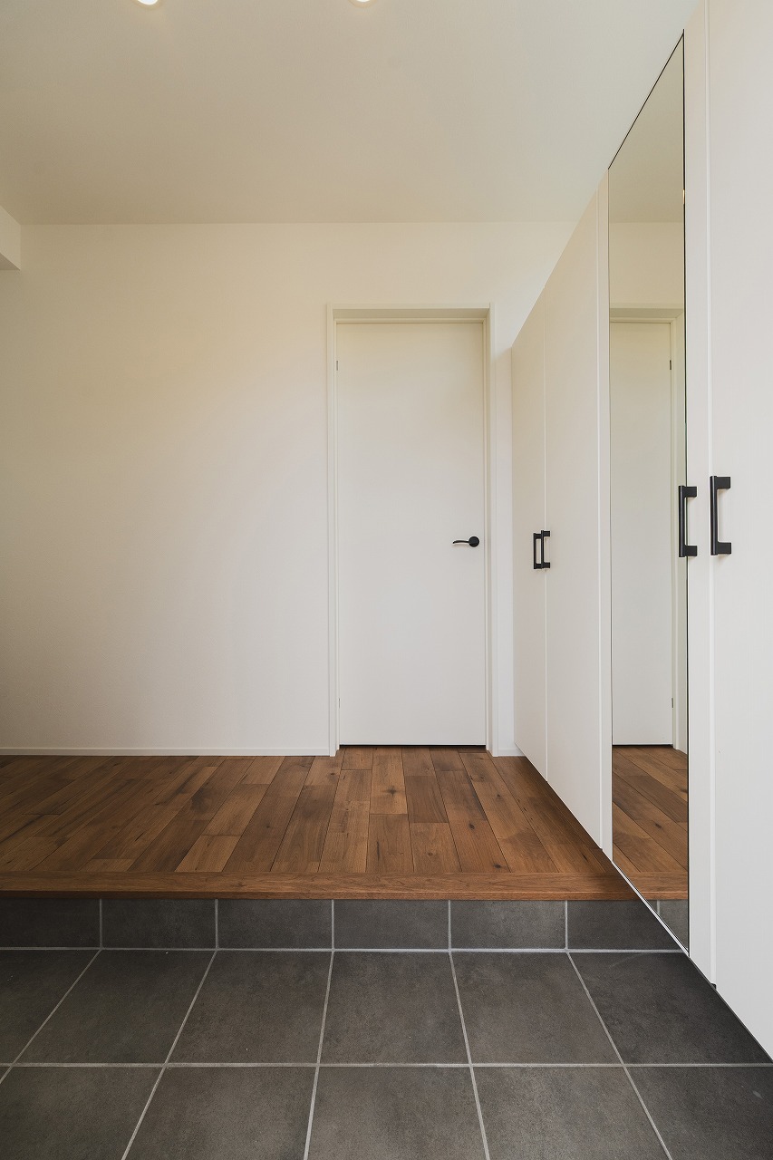 壁面収納のシューズボックスを採用し、収納力を確保。全身を確認できるミラー付きです [03:59]。