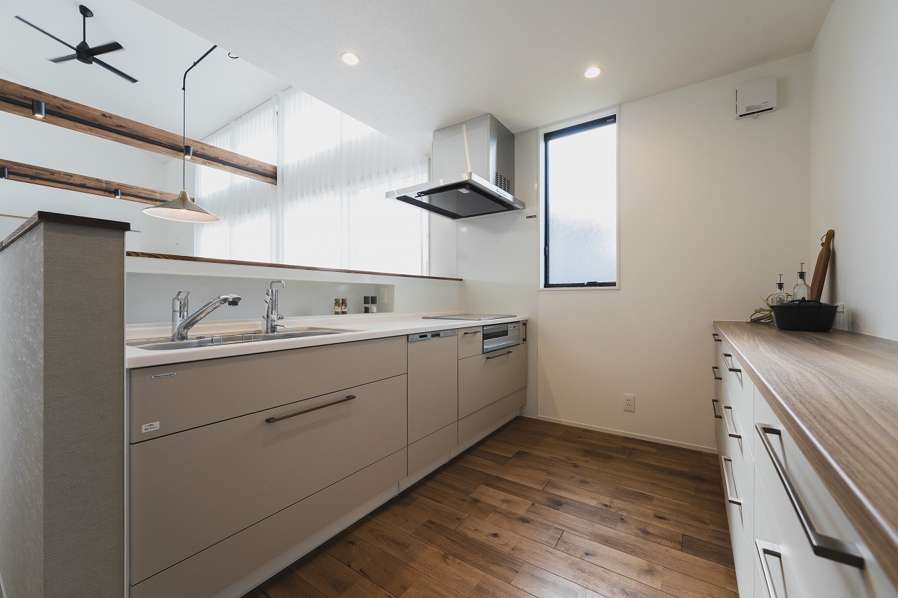 タカラスタンダードのキッチンを採用。手元を隠すことができるため、生活感が出にくく、見た目の美しさを保てます [09:34]。