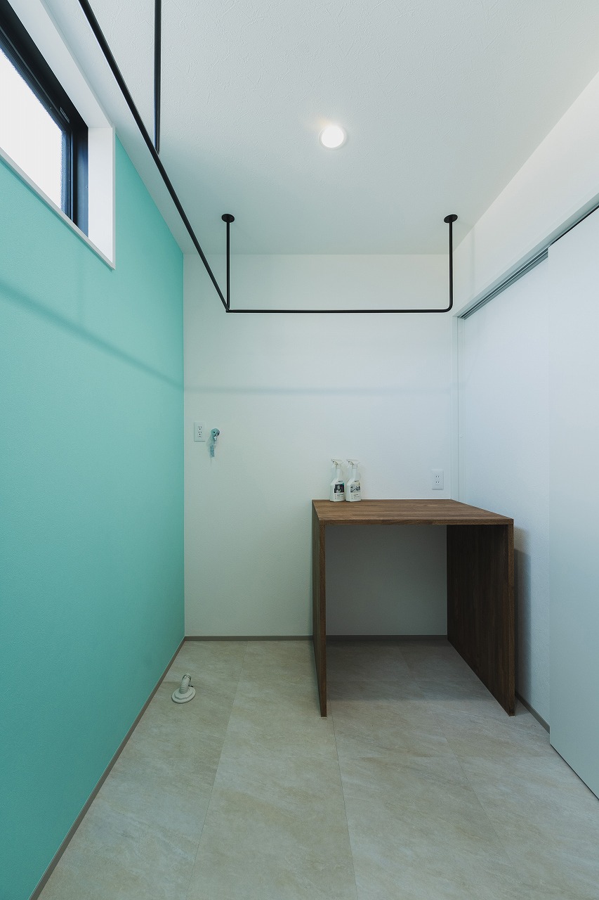 洗濯機、作業台、ハンガーパイプ、可動棚を備え、家事動線に配慮した設計です [15:13]。