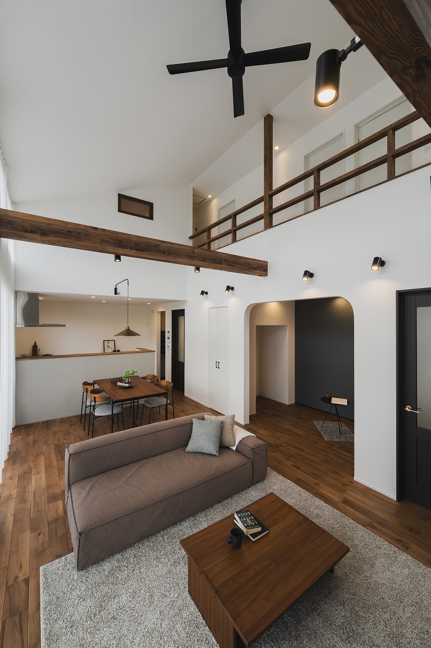 吹き抜けの最も高い位置で5.6m、低い位置でも3.8mの天井高を確保。実際の広さ(19帖)以上に、広々と感じられる立体的な空間構成です [06:48]。