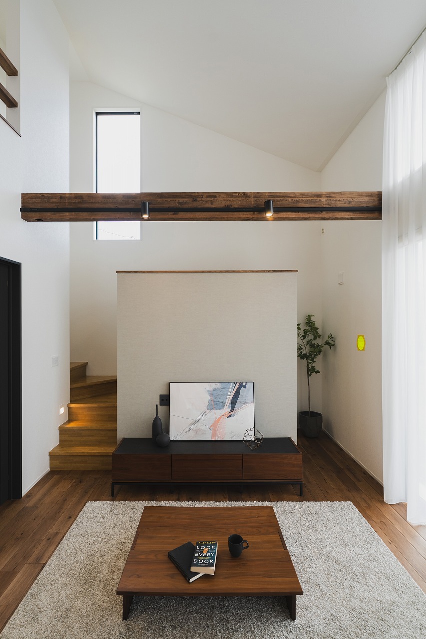 ご主人の要望により、ペレットストーブを採用 [01:39]。この暖かさを家全体に行き渡らせるため、吹き抜けで1階と2階を繋ぐ空間構成となっています [22:18]。