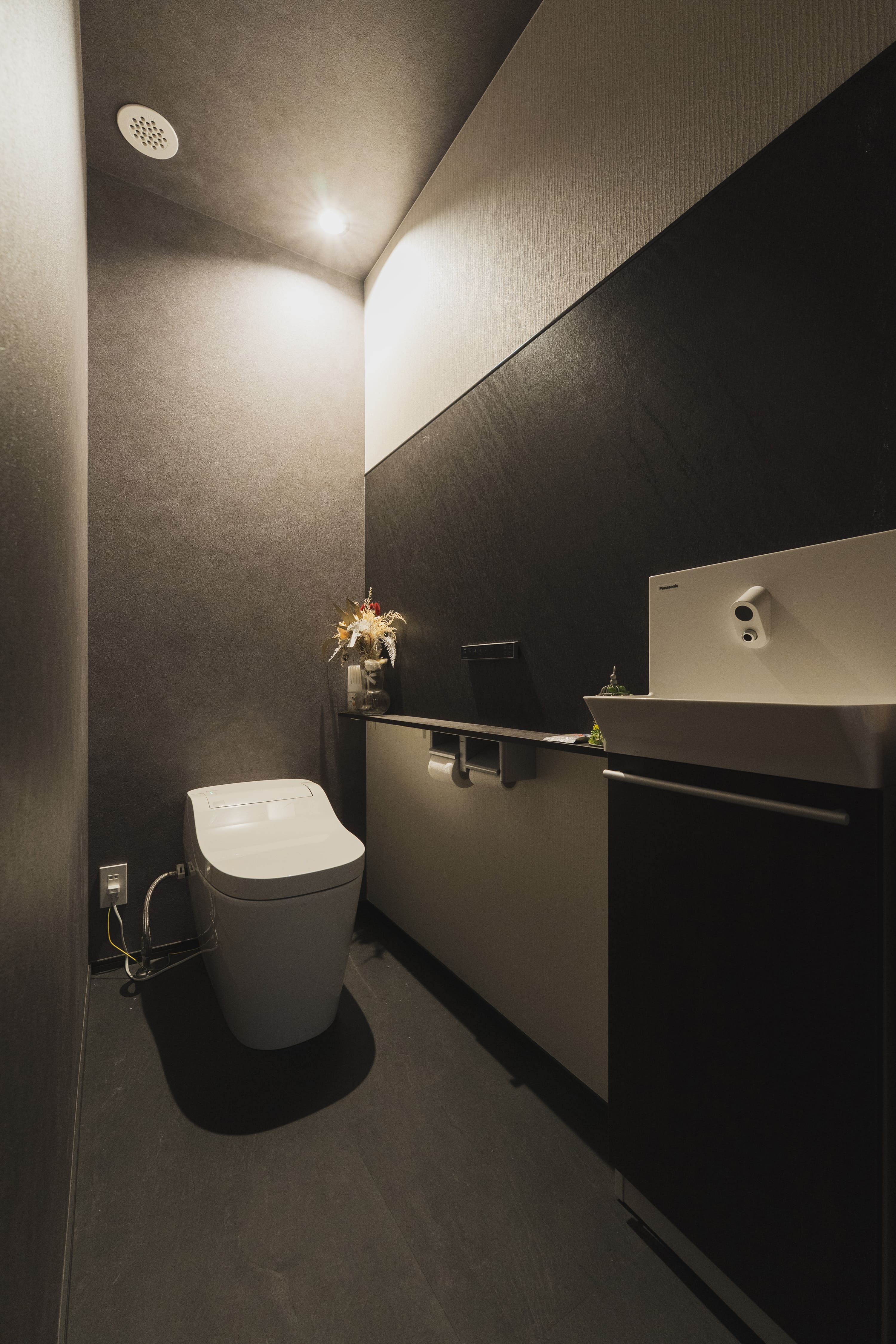 1階の寝室近くのトイレは、夫の強い希望であえて暗めの空間に。