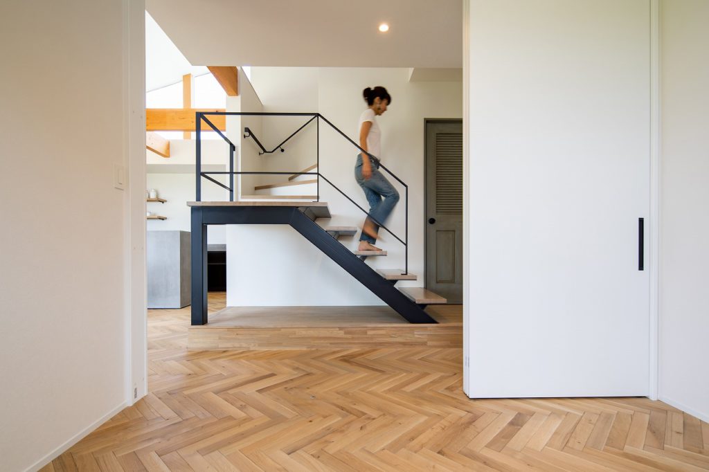 幾何学的なヘリンボーンは、ナチュラルでいながらモダンな雰囲気を演出してくれるので、階段のブラックアイアンとも相性がいいですね。