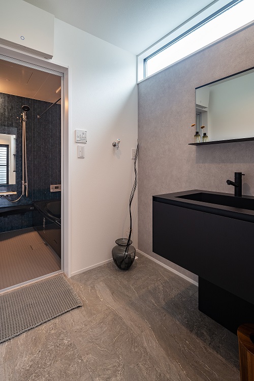 洗面もお風呂も、黒で全体的に落ち着いた色合いになっています。