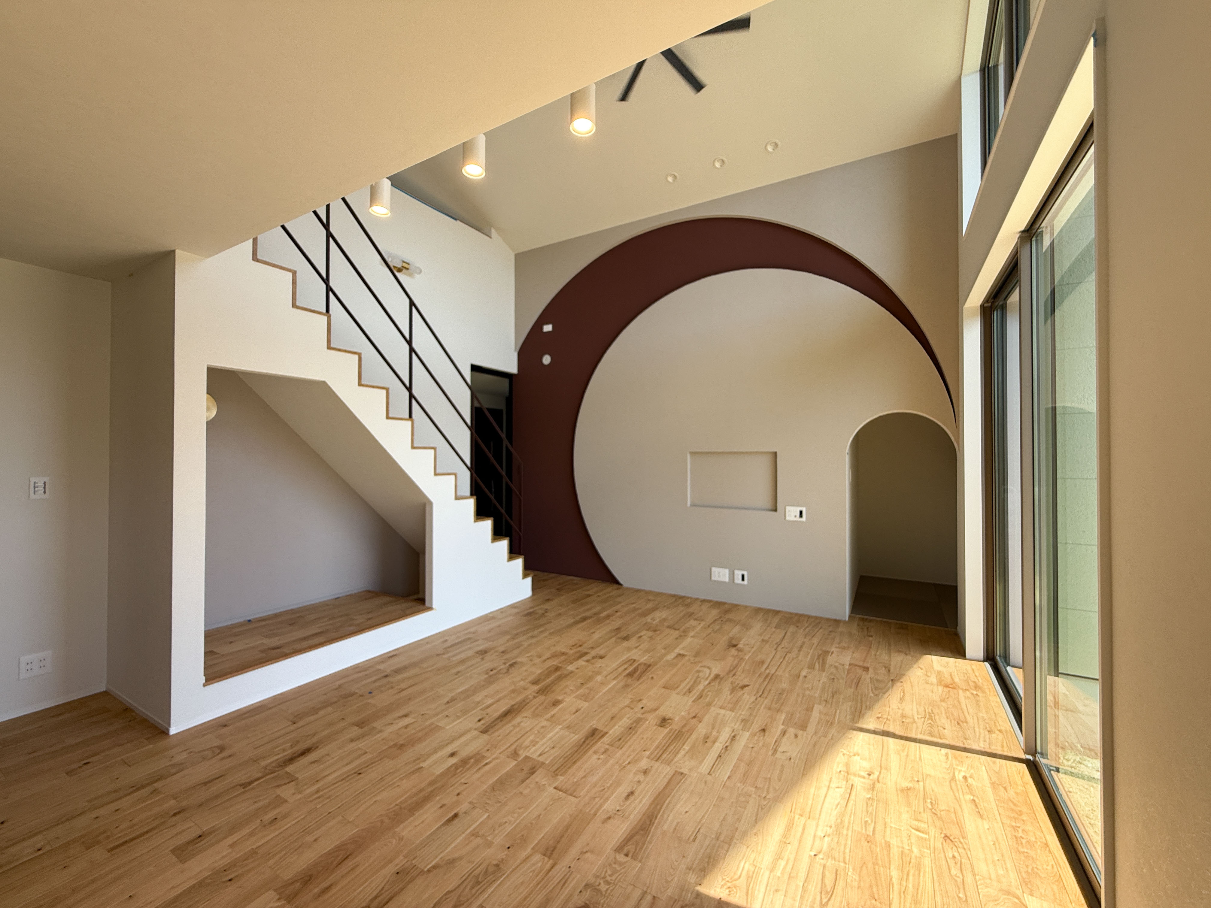 【吹き抜けリビング】目を引くリビングは心躍るカラーとデザインで和の雰囲気を塗り壁で演出