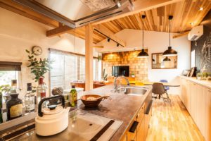 西洋風の外観、カフェ風のキッチンでありながら土間や無垢素材を使い落ち着きのある雰囲気の事例です。