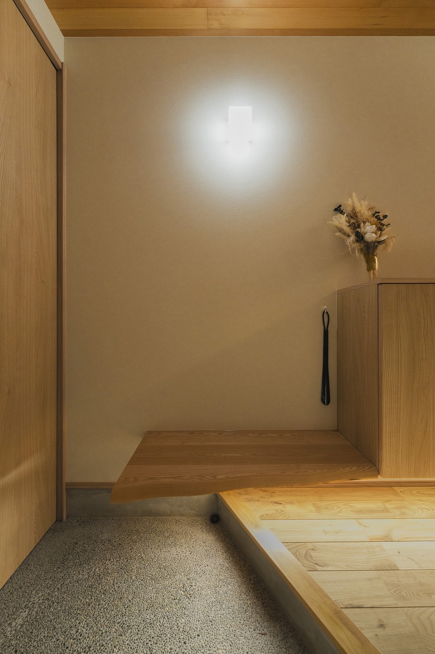 天板にハギ材を使用し、旅館のような非日常感と、普段使いの靴を置く実用性を両立 [05:16]。