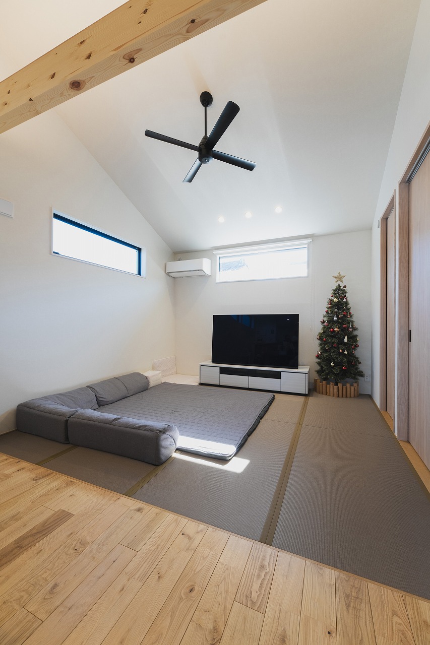 家族が地べた族であるため、ソファーを置かず、リビング全体を思い切って畳敷きに [23:00]。