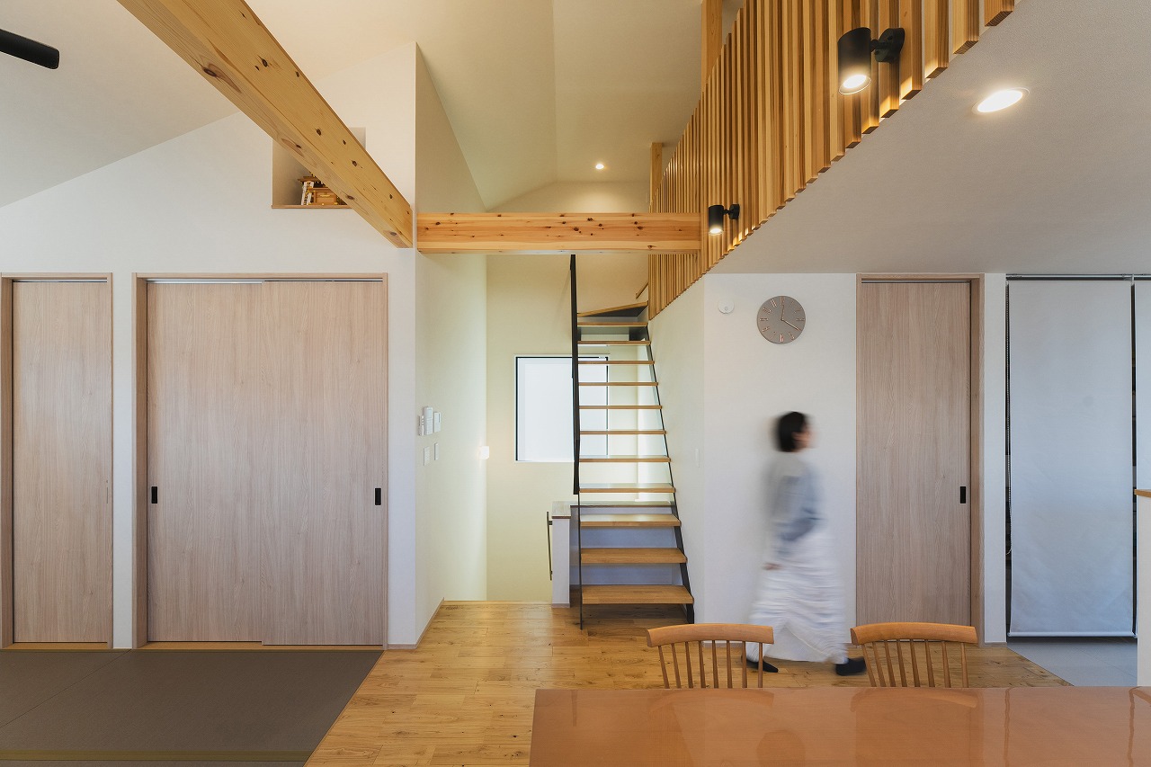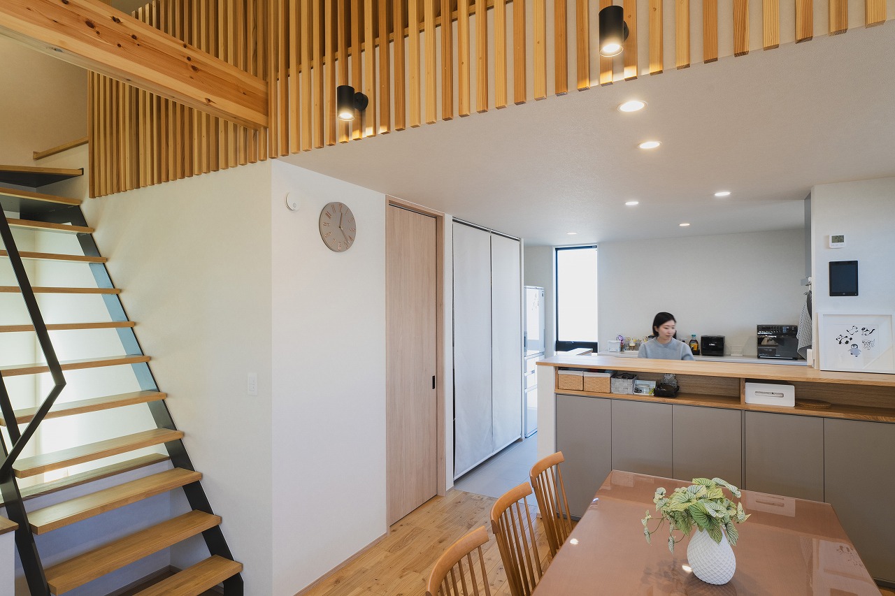 吹き抜け部分には希望であった格子をアクセントとして採用 [26:43]。