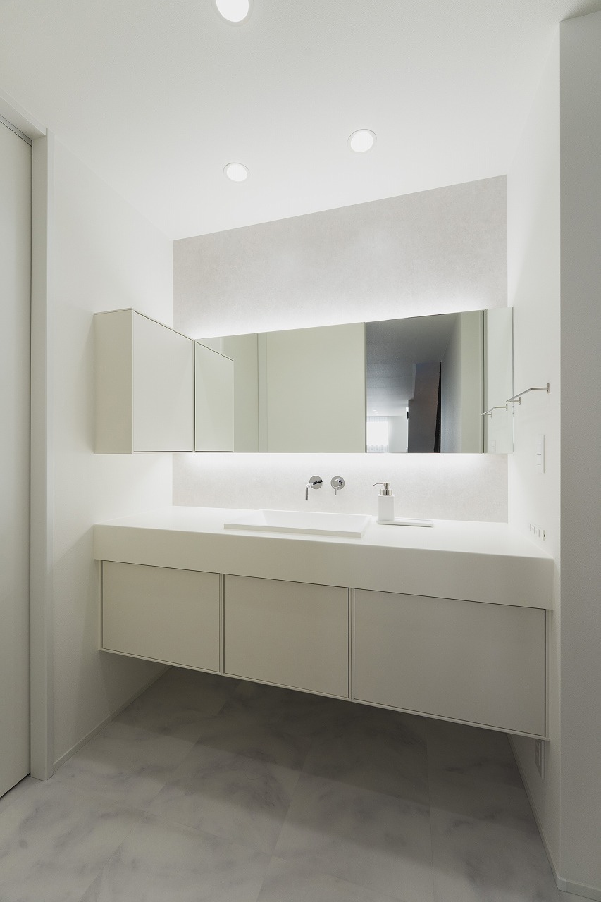 女子4人が将来並んで身支度できるよう、洗面台を可能な限り広く設計。