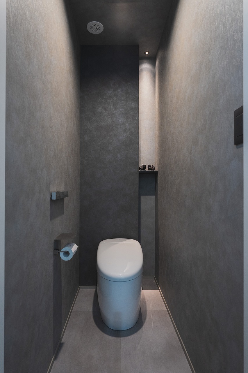 ご主人念願の照明と、沖縄旅行のエピソードが詰まった「シーサー」が飾られたこだわりのトイレ。ここでも3色のルールは徹底されています [15:32]。