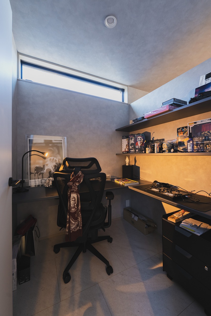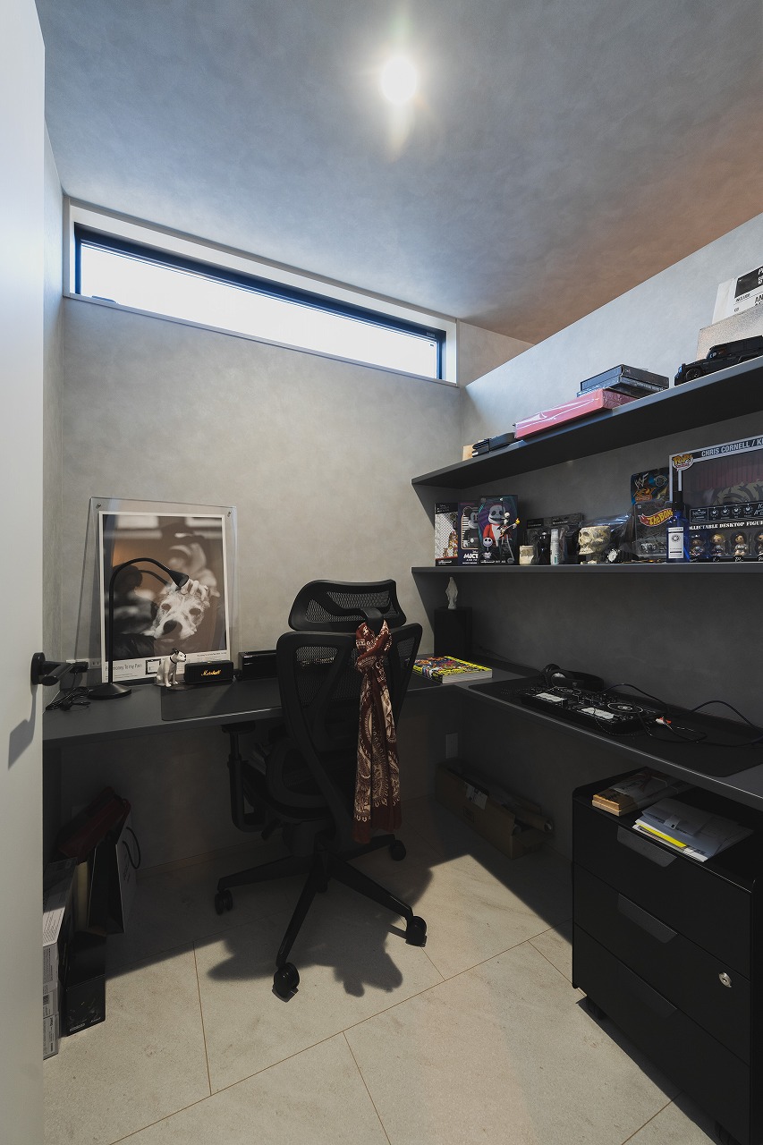 グレーとブラックで統一された落ち着きのある書斎を完備。寝室と繋がる天井デザインにより、空調の効率も配慮されています [19:44]。