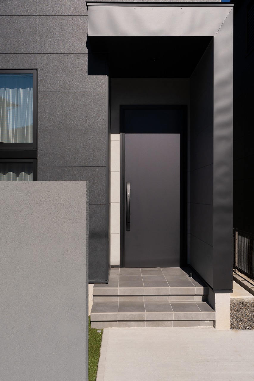 玄関周りには薄いグレーを差し色として使い、ドアもブラックで統一したクールな印象です [03:04]。