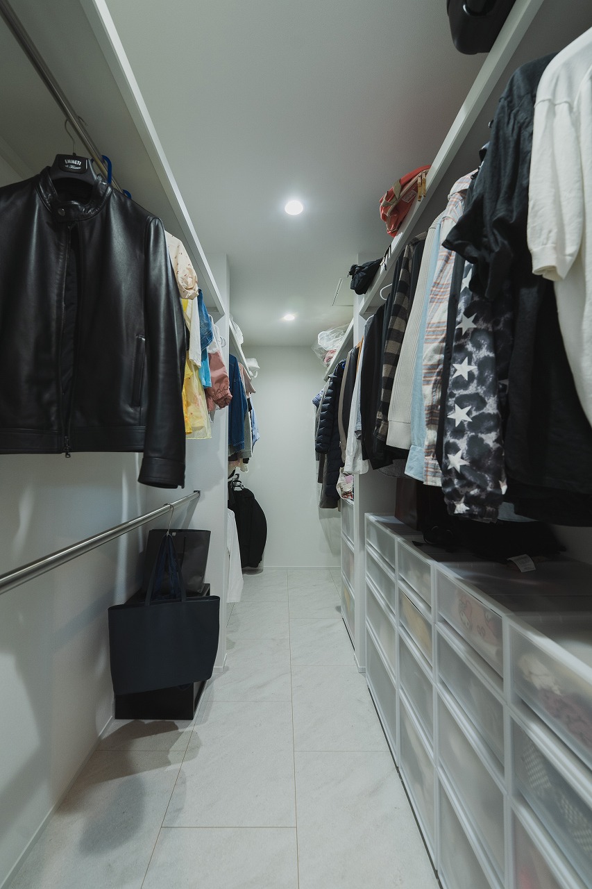 7帖分のクローゼットを配置。家族5人の衣類が1階と2階でしっかり収まるよう計画されています [18:43]。