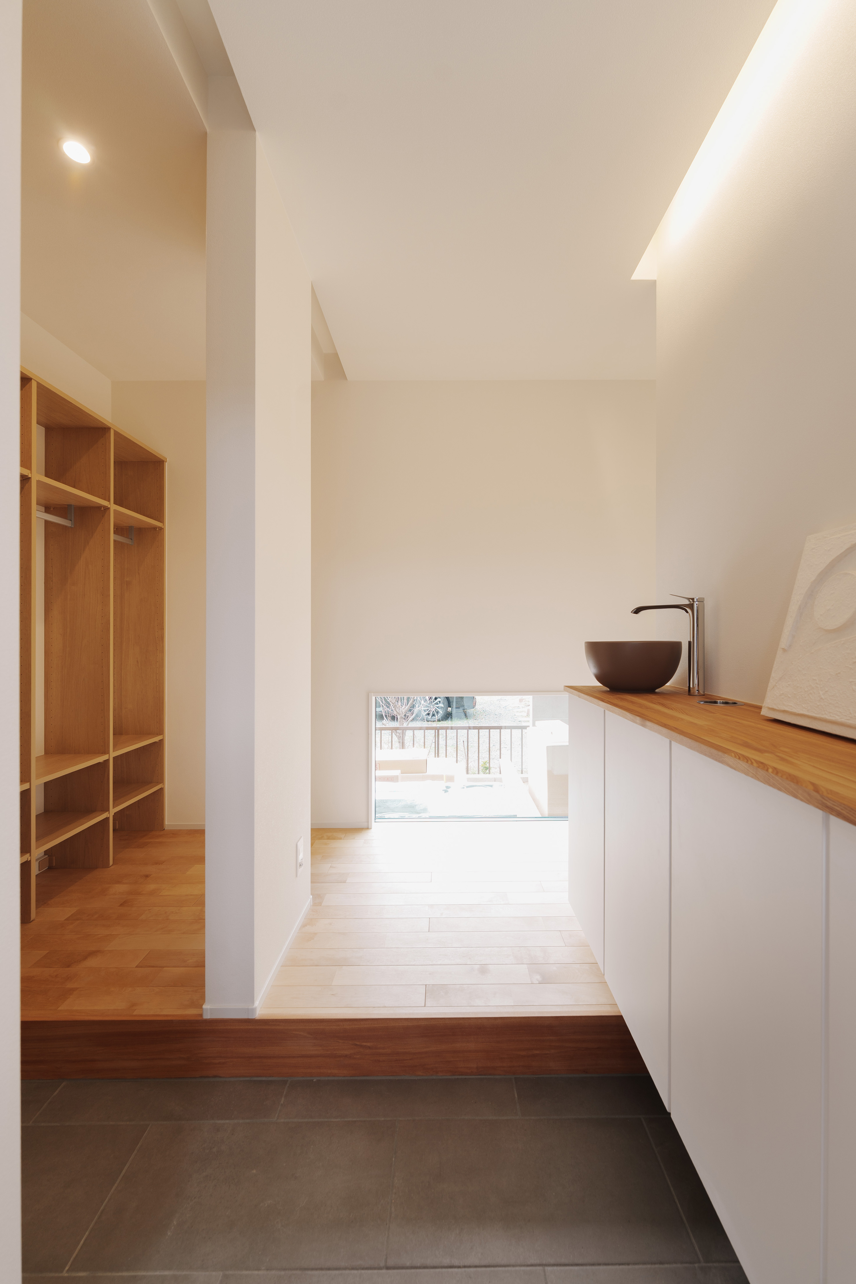 玄関横には、既製品を組み合わせコストを抑えた手洗いを配置。