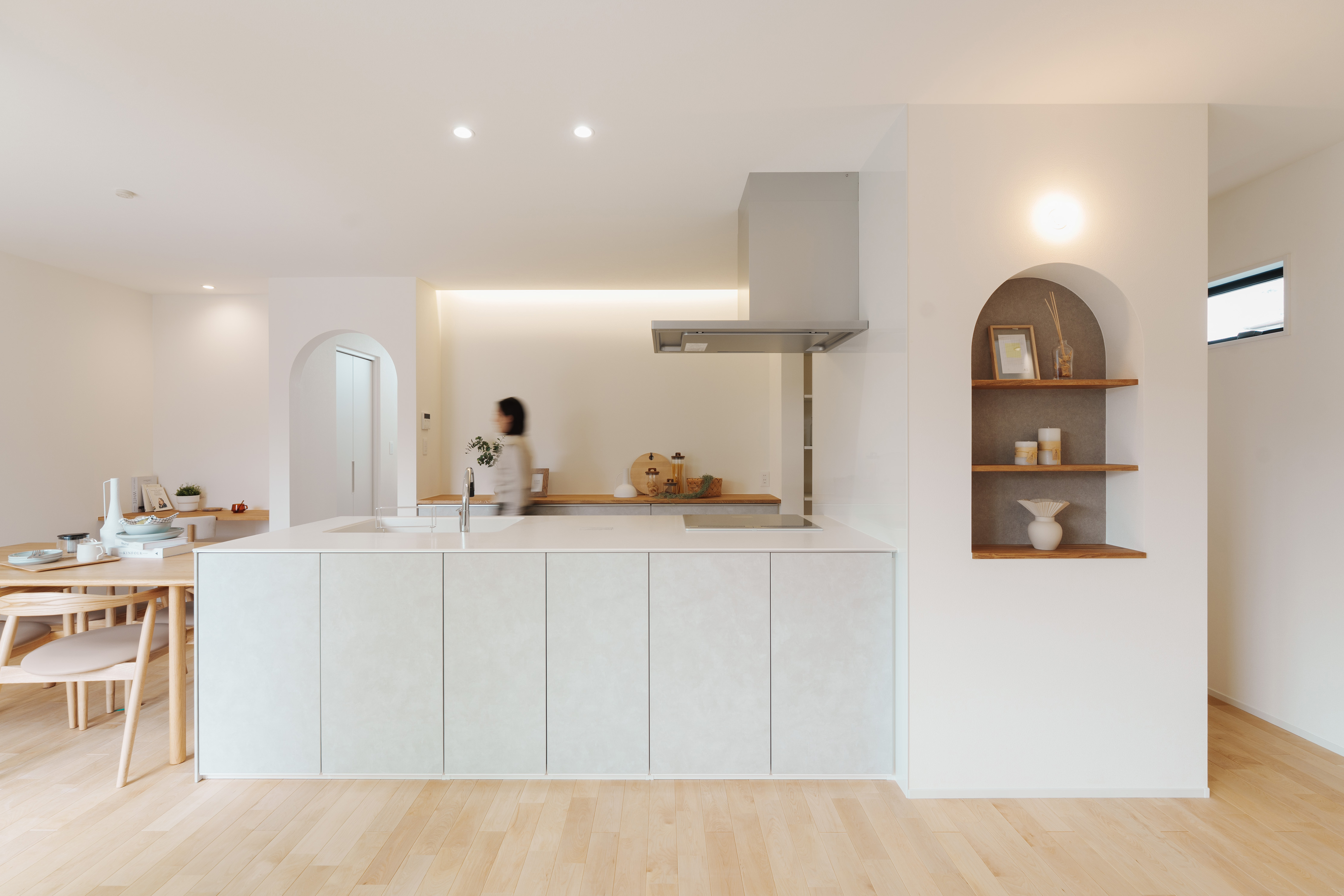 パントリーの入り口やキッチン背面の壁をR形状に仕上げ、空間に柔らかさと驚きをプラス。家族の写真を飾るための専用ニッチも設けられています [14:07]。