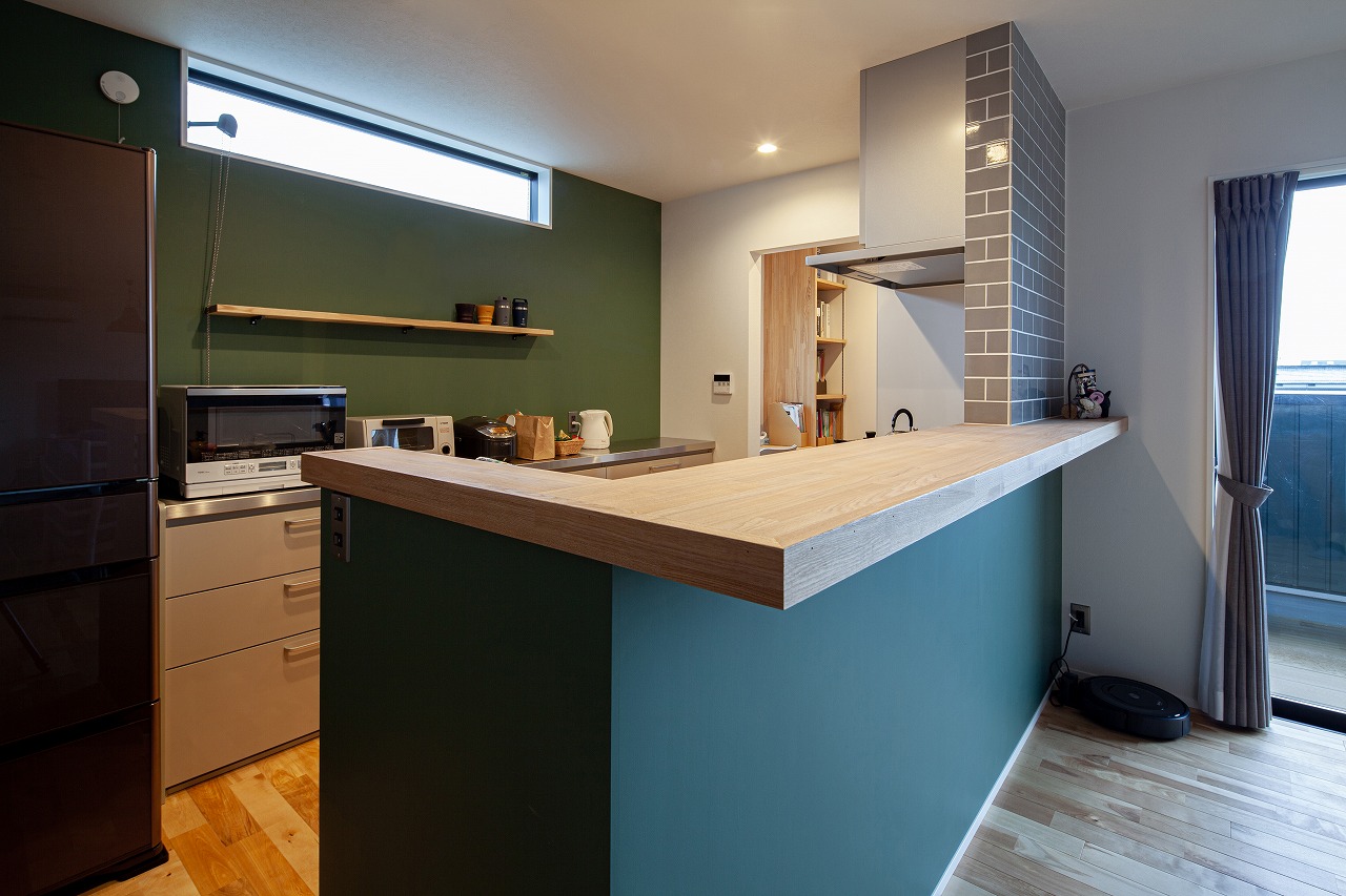 あとは、リビングもこだわった場所の一つです。腰壁のタイルに、アクセントクロス、ステンレスのカウンターなど、家の雰囲気にあわせて素材にもこだわりました。ステンレスのカウンターは、オオトリさんにオーダーメイドで造っていただきました!